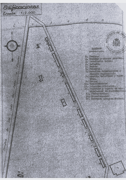 Esta imagen muestra un plano técnico militar de una parcela con diversas edificaciones, titulado "Edificaciones" con una escala de 1:2.000. El documento tiene un sello oficial del Ministerio de Defensa de España (Archivo Histórico del Ejército).
