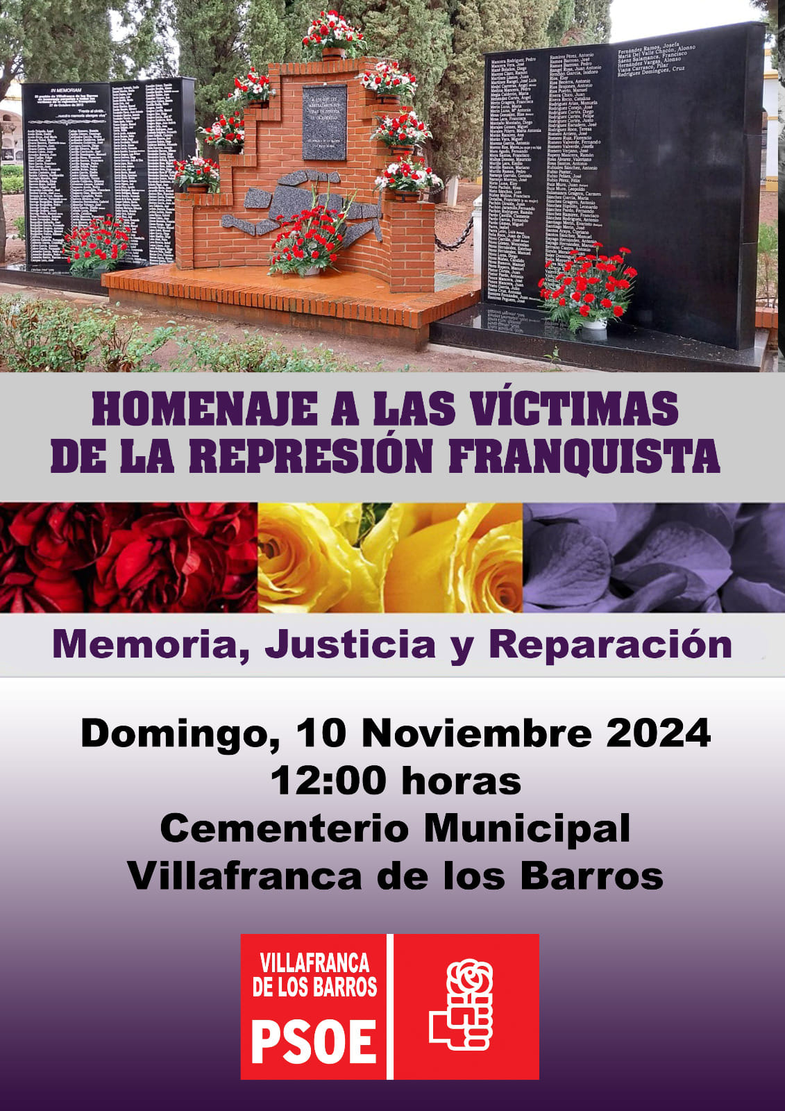 Como cada año, desde la Secretaría de memoria histórica y democrática del PSOE de Villafranca de los Barros. Se realiza el acto de homenaje a los represaliados de la dictadura y la represión franquista. En el cementerio municipal de Villafranca de los Barros.